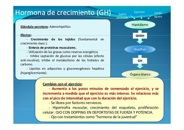 | Hormona de crecimiento | Somatotropina | GH, STH | Polipéptido | Somatotropas | Acidófilo | Hígado, tejido adiposo | Promueve el crecimiento; metabolismo de lípidos y carbohidratos |